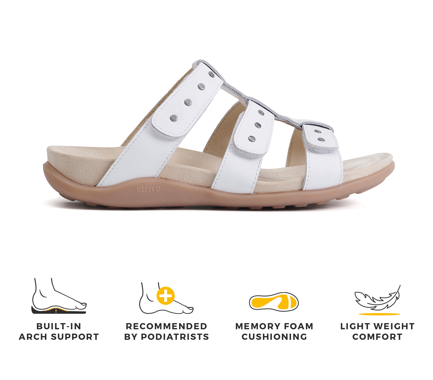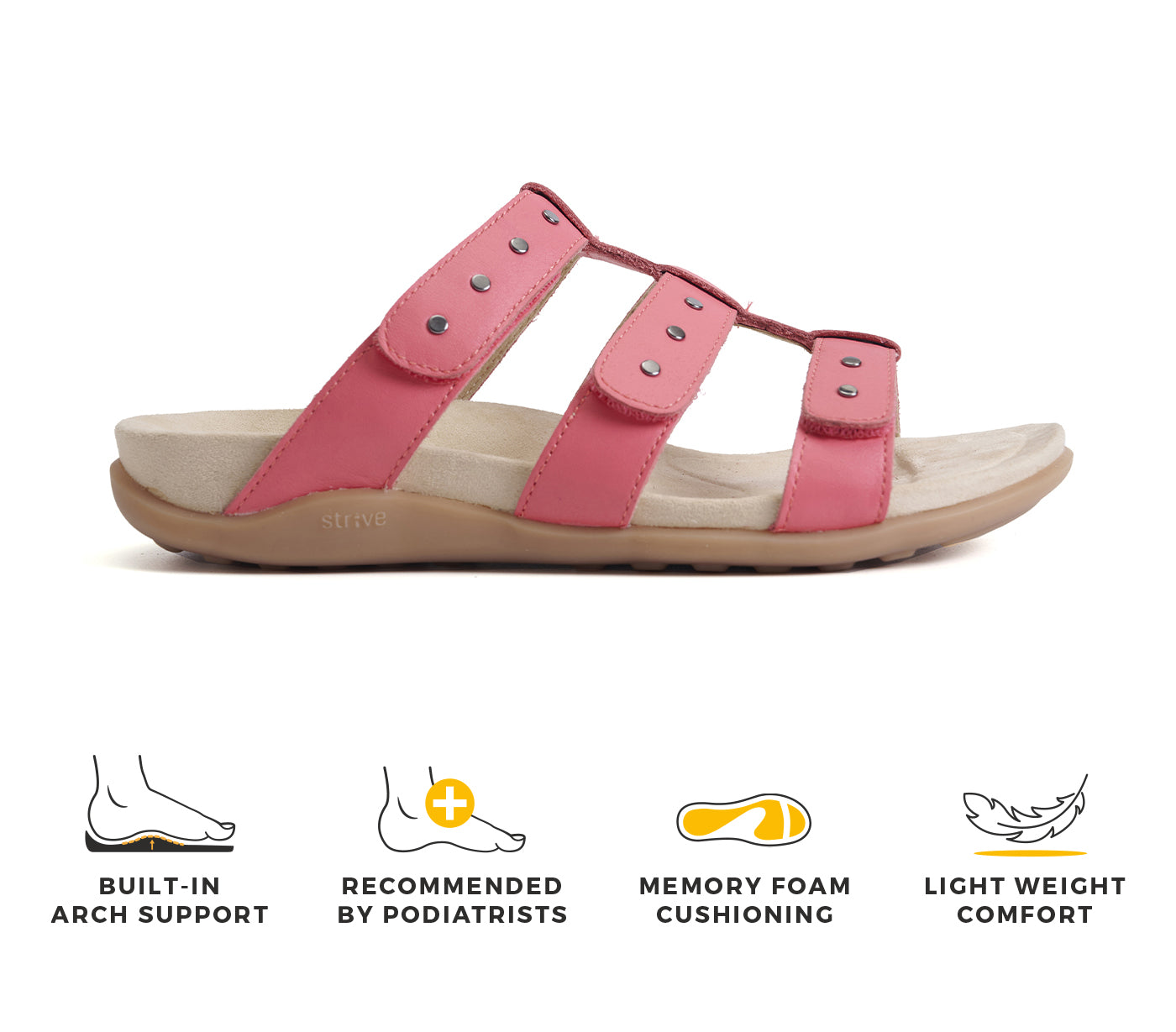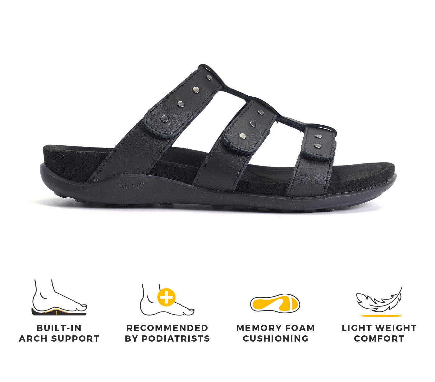 - Unlike standard footwear, Strive’s orthotic footbed supports natural foot posture.